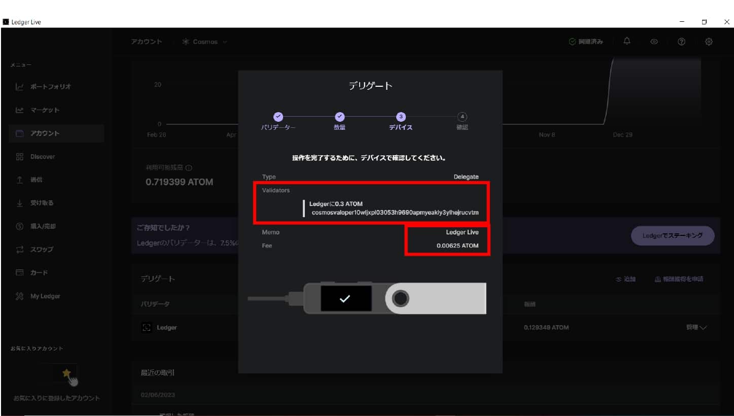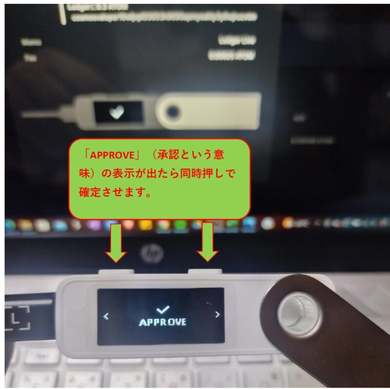念のためですがPC上に表示されているトランザクションと手数料がデバイスの画面と一致していることをしっかり確認しましょう。