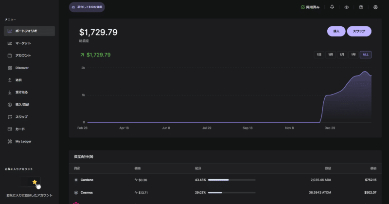 本日は、レジャーナノSプラスを使って、アトム(コスモス)をステーキングする方法を解説していきたいと思います。※レジャーのデバイスを接続してPINは解除したところから始めていきます。