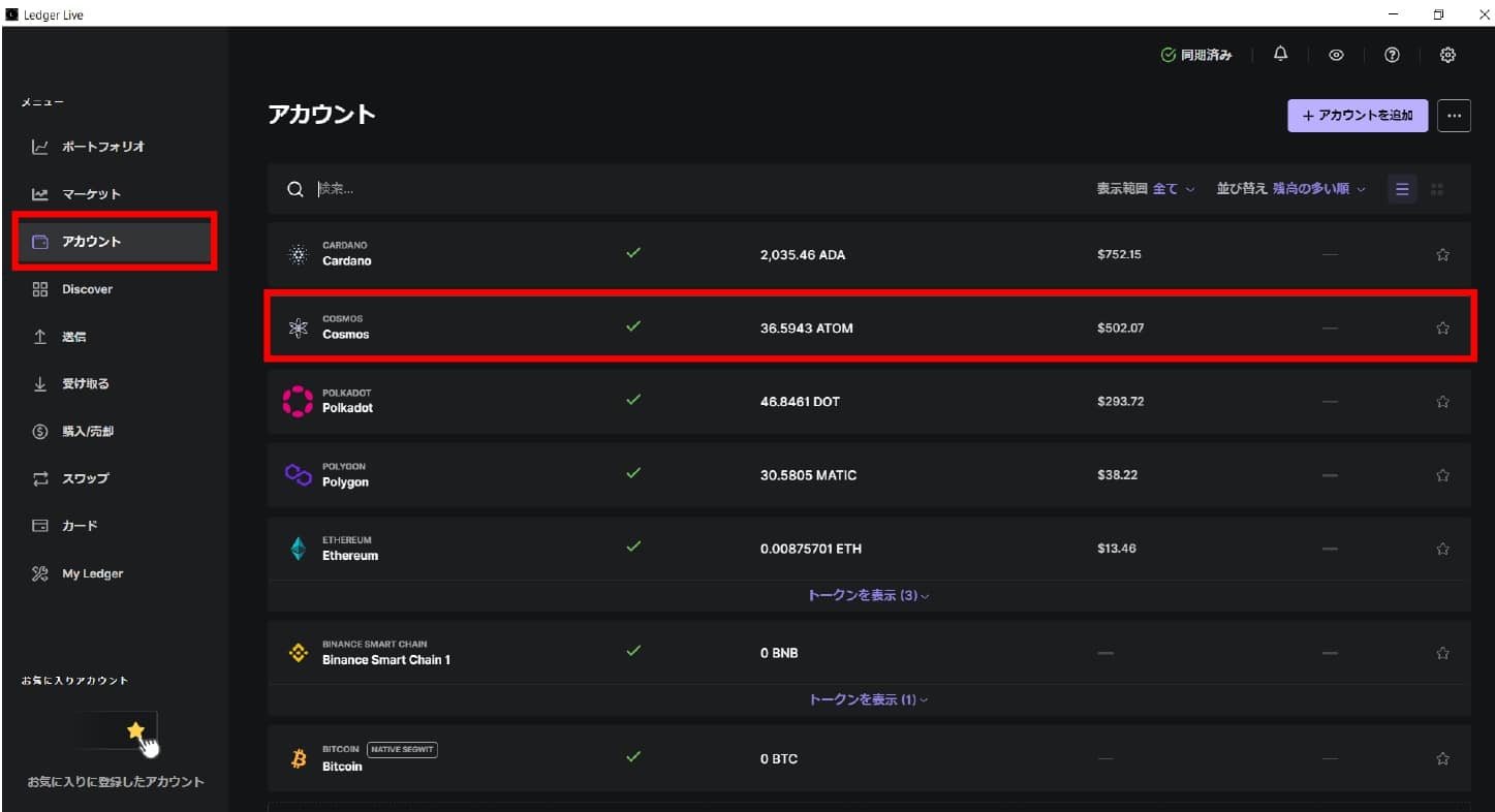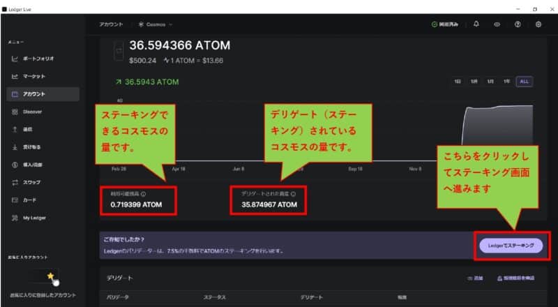 アトムの残高を確認してステーキング画面へ