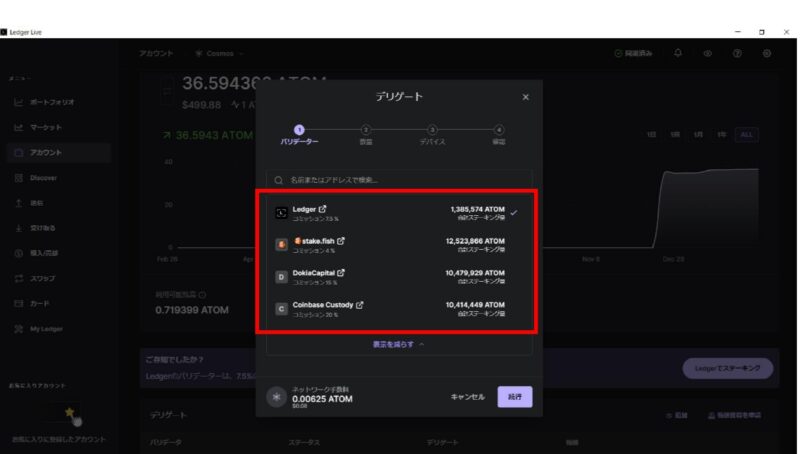 委任する先によって報酬率は様々ですが私はレジャーが運営している委任先でステーキングしています。レジャーの報酬率は年利7.5%です。画像が粗くて見えづらいですが「すべて表示」をクリックすると委任先リストが出てきます。