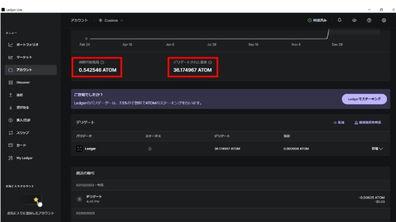 最後にステーキングされたアトムの残高を確認