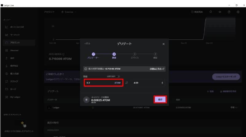 3枚目の画像で利用可能な残高が約0.7アトムあったので今回は0.3アトム(日本円にして約530円ほど)をステーキングしようと思います。