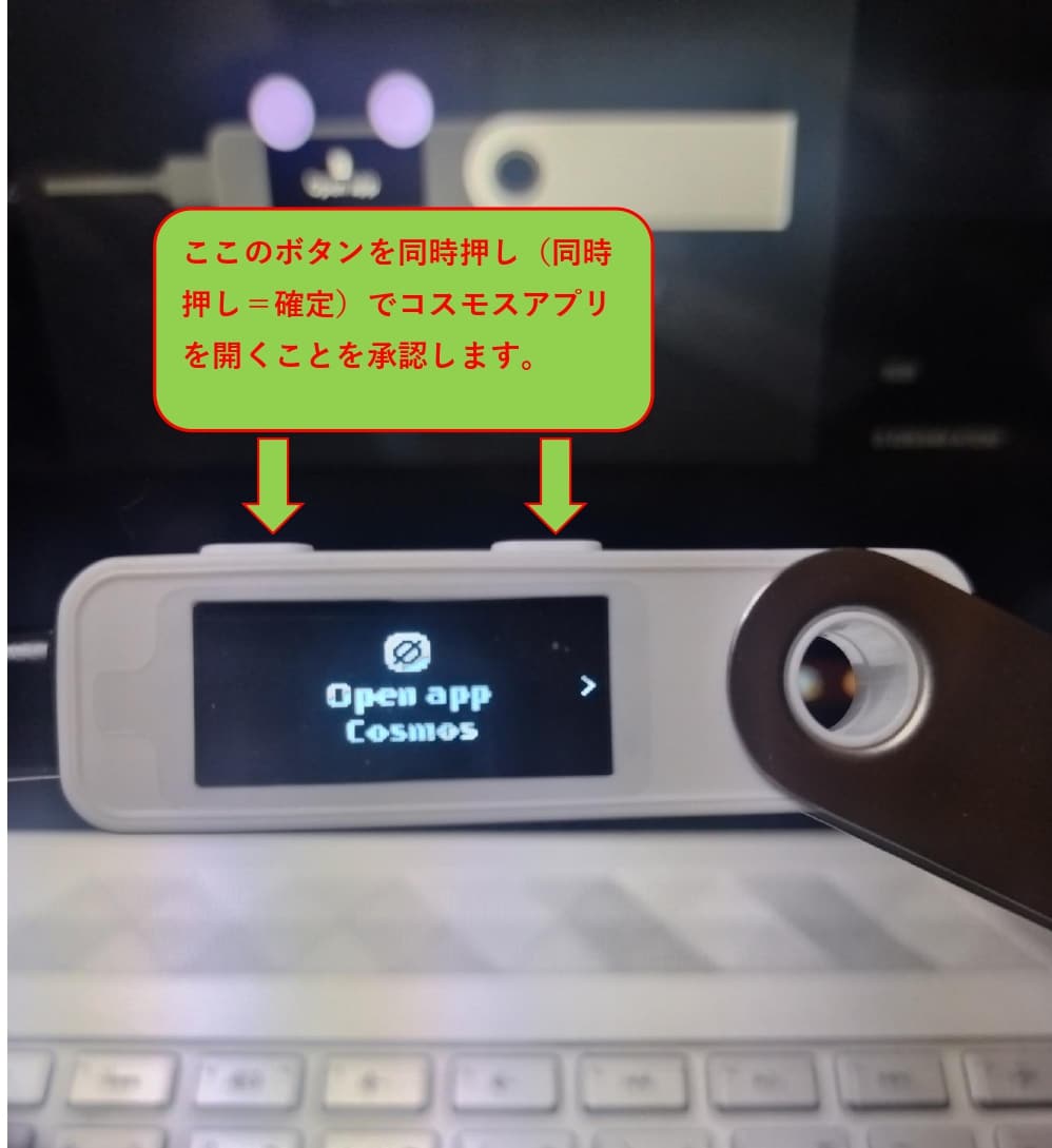 デバイスの画面では以下のように自動的に「Open app Cosmos」と出てくるのでデバイスの上部についている左右のボタンを同時押しすることでコスモスアプリを開くことを承認します。